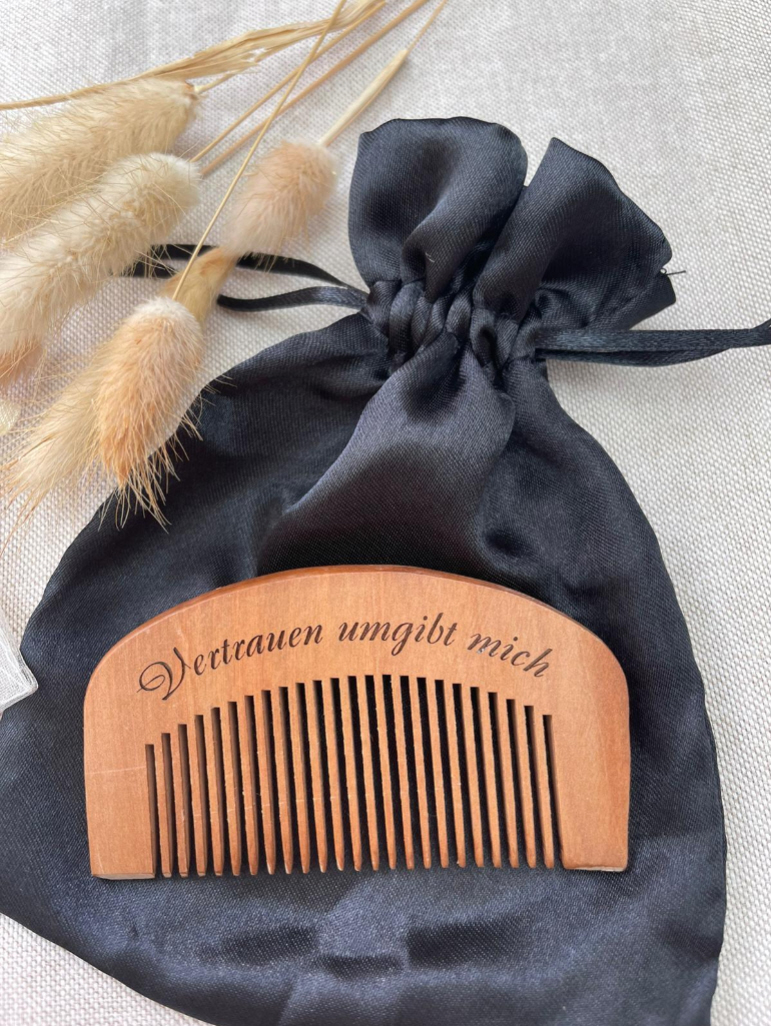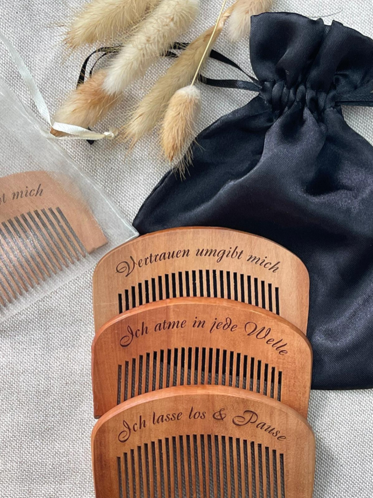 Entdecke meinen mit Liebe angefertigten Holzkamm, graviert mit stärkenden Affirmationssprüchen. Gerfertigt aus Sandelholz wird dieser bei deiner Geburt ein wahrer Unterstützer sein können.