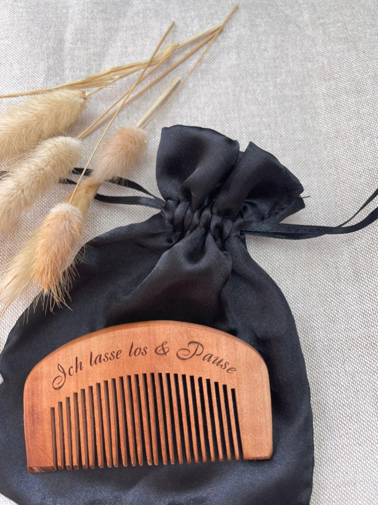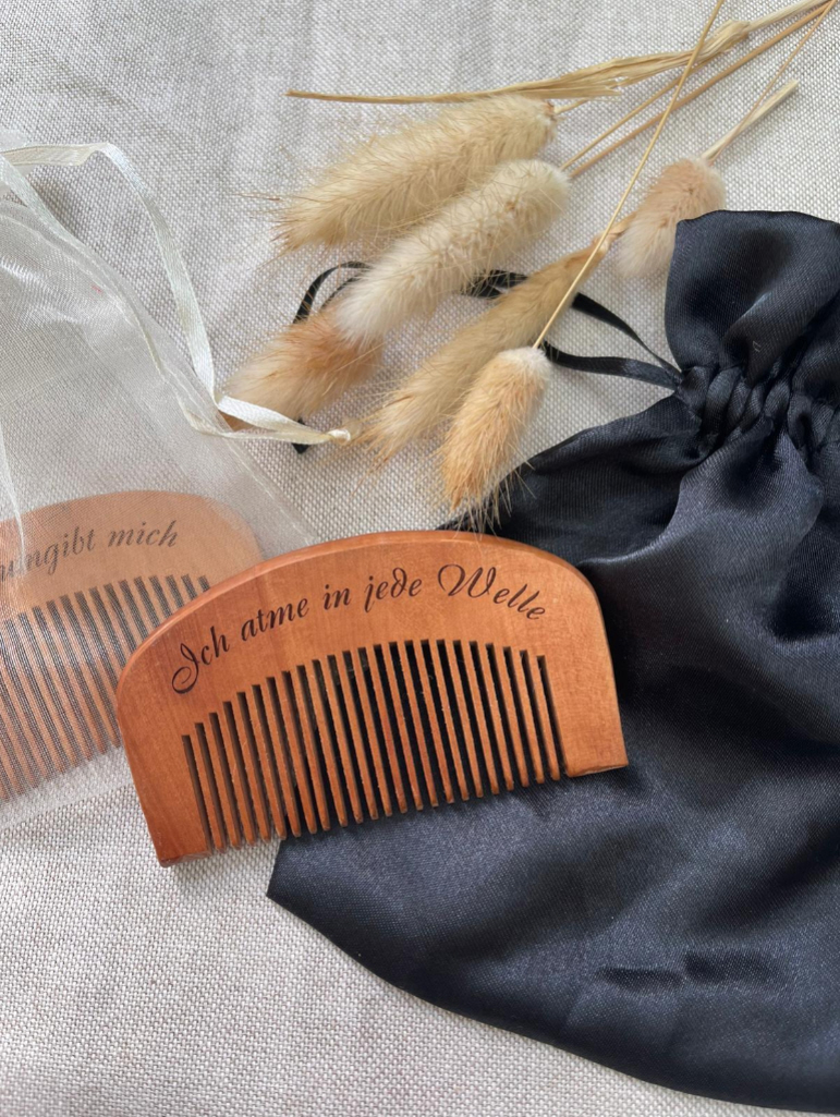 Der gravierte Holzkamm ist damit mehr als nur ein Haarpflegeprodukt – er ist ein Begleiter während deiner Geburt und auch in die Welt deiner positiven Gedanken.